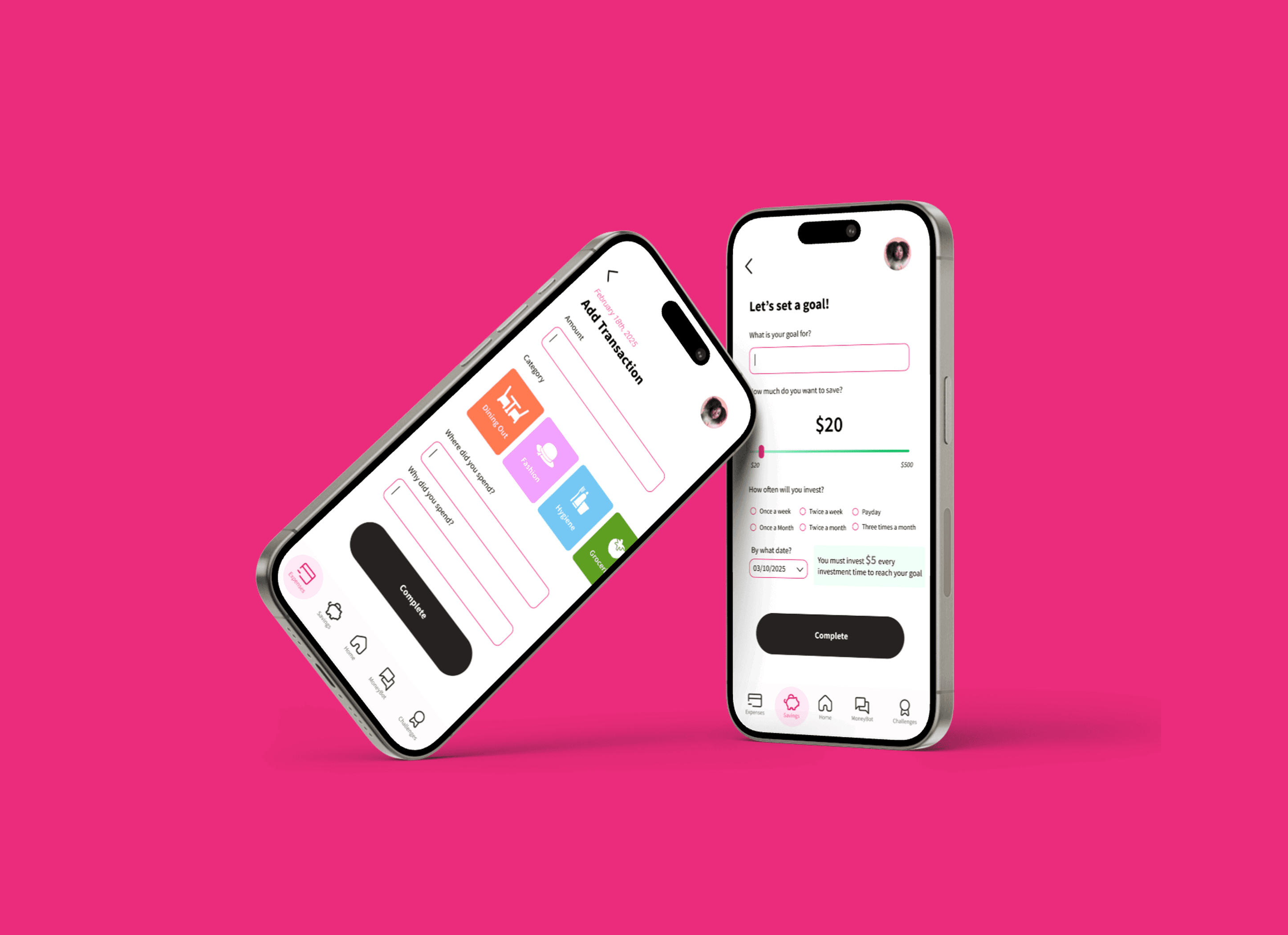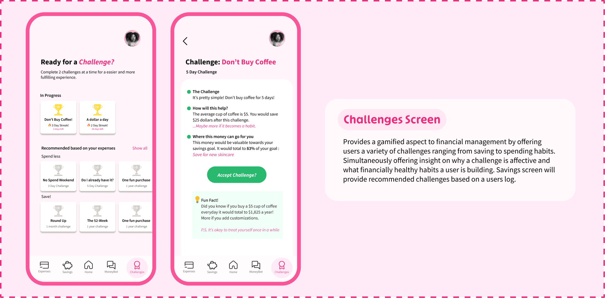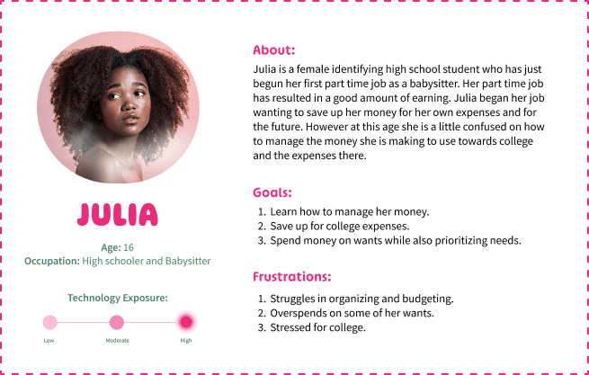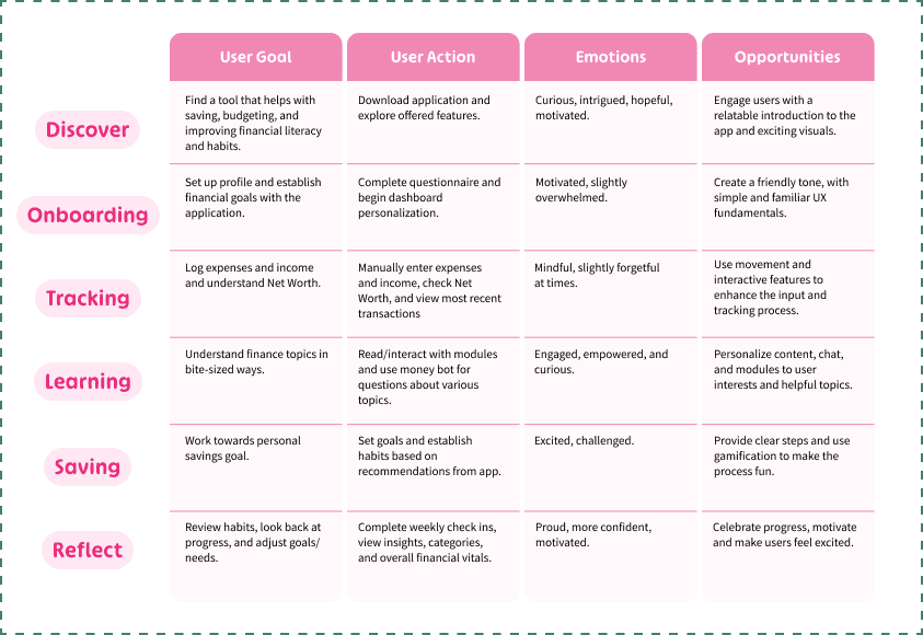 Based on interviews with young women (ages 14–22), a survey targeting high school and college-aged women, and secondary research on financial literacy rates in women, it was found that women often struggle with saving sue to lack of visibility into their habits. Additionally the rise of short attention spans has made traditional finance education ineffective. Now younger generations prefer a learning model incorporating challenges, gamification, and interactive visual learning.