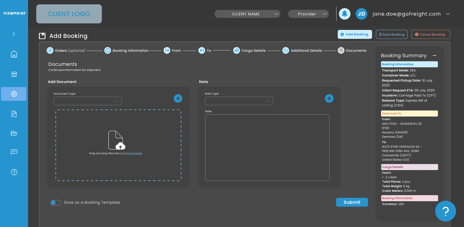 A streamlined wizard simplifies high-volume freight booking, reducing the perceived complexity of the task and accelerating the path from quote to shipment.